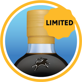 Top of a bottle with black cap, 'LIMITED' label on yellow background.